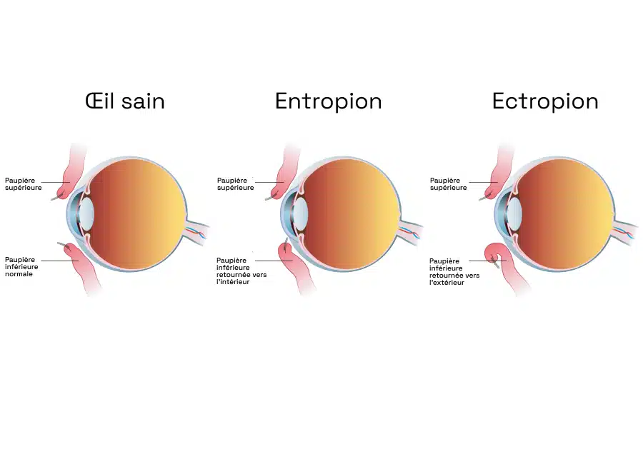 L’ectropion, avec une paupière qui se tourne vers l’extérieur, nécessite également une évaluation approfondie pour choisir la technique chirurgicale appropriée :