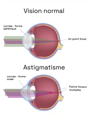 Dans l’astigmatisme, la forme irrégulière de la cornée provoque une déformation des images et affecte toutes les distances.