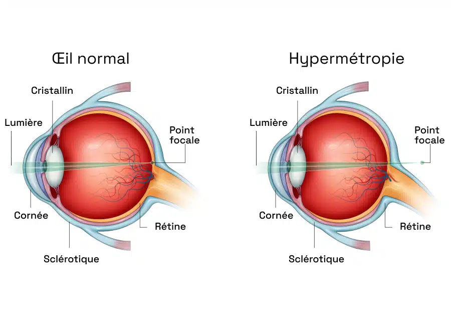 Ce trouble se manifeste lorsque les rayons lumineux entrant dans l’œil convergent derrière la rétine. Cela provient :