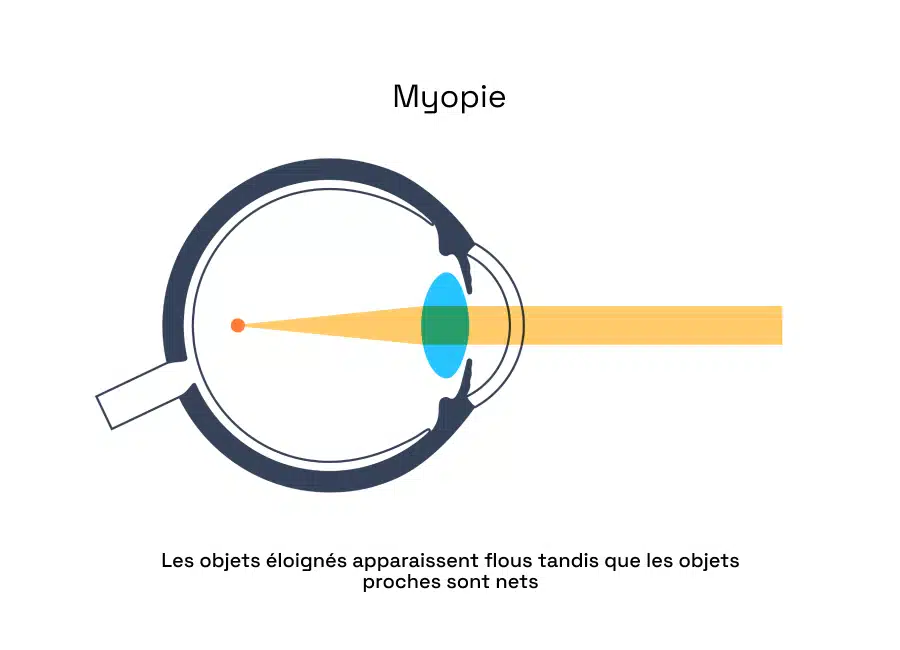 La myopie survient quand la focalisation des rayons lumineux se fait en avant de la rétine, rendant floue la vision de loin. Cette anomalie est souvent causée par une forme allongée de l’œil ou une courbure excessive de la cornée, perturbant ainsi la netteté de l’image.